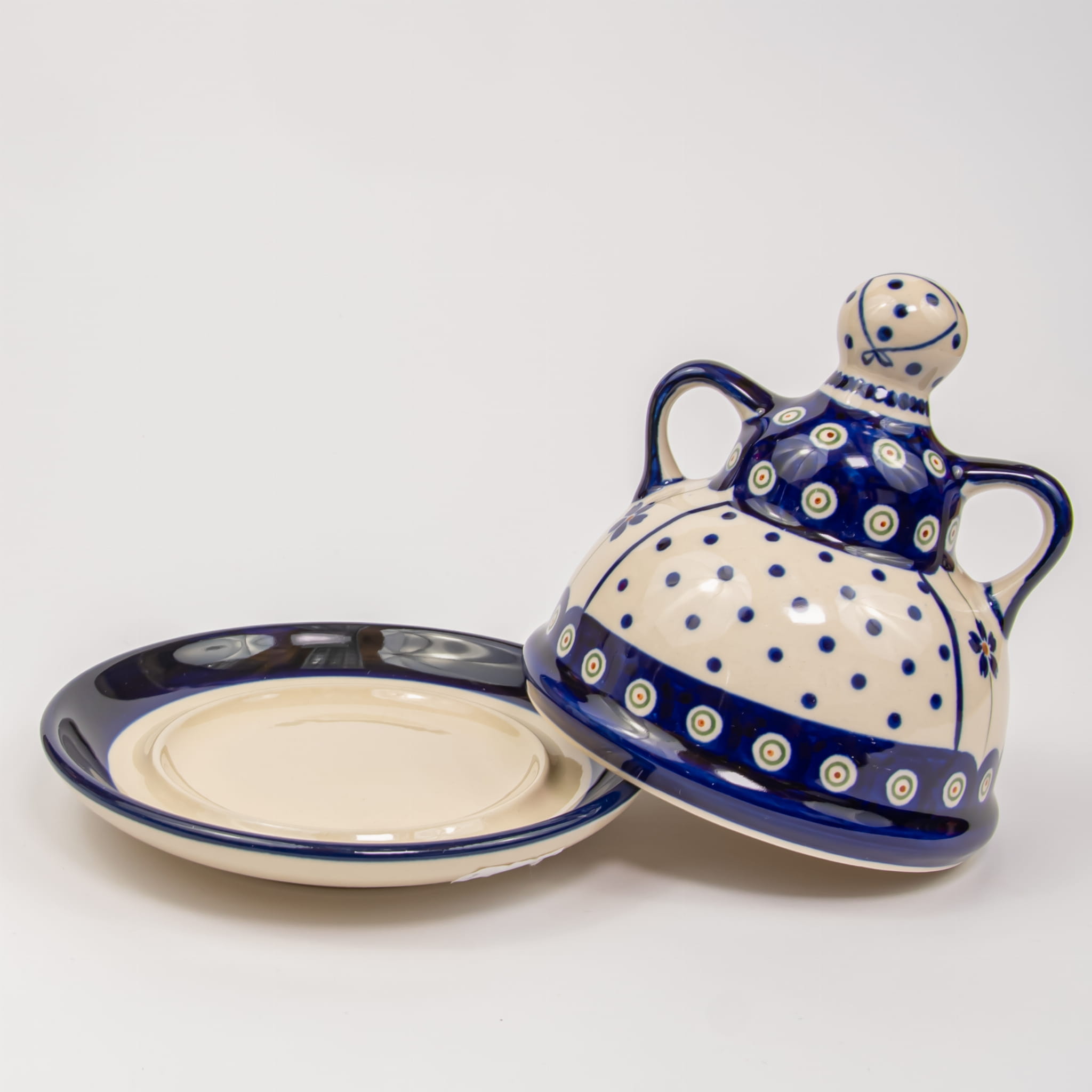 Baba do sera o wysokości 12 cm. Składa się z podstawki oraz pokrywki z dwoma uchwytami. Odpowiednia do przechowywania serów, wędlin oraz innych produktów spożywczych. Zabezpiecza przed nadmiernym wysychaniem jedzenia. Produkt wykonany z bolesławieckiej glinki ceramicznej, ręcznie formowany i dekorowany przez artystę Zakładów Ceramicznych Bolesławiec. Może być bezpiecznie używane w zmywarce i mikrofalówce. Dekoracja nr 166A wchodzi w skład grupy dekoracji artystycznej Ceramiki Bolesławieckiej. Naczynia w tym wzorze dekorowane są podszkliwnie, za pomocą stempli i pędzla.