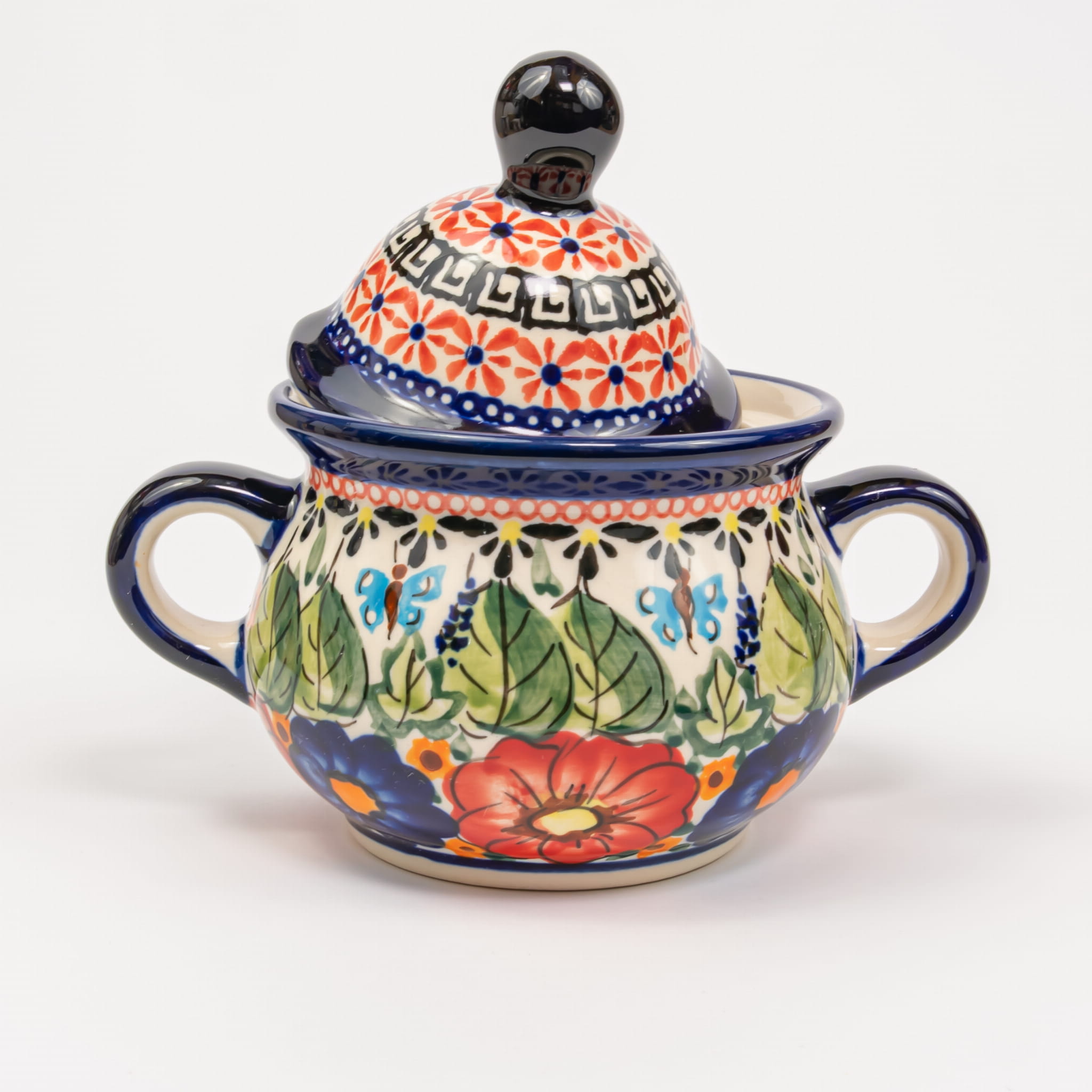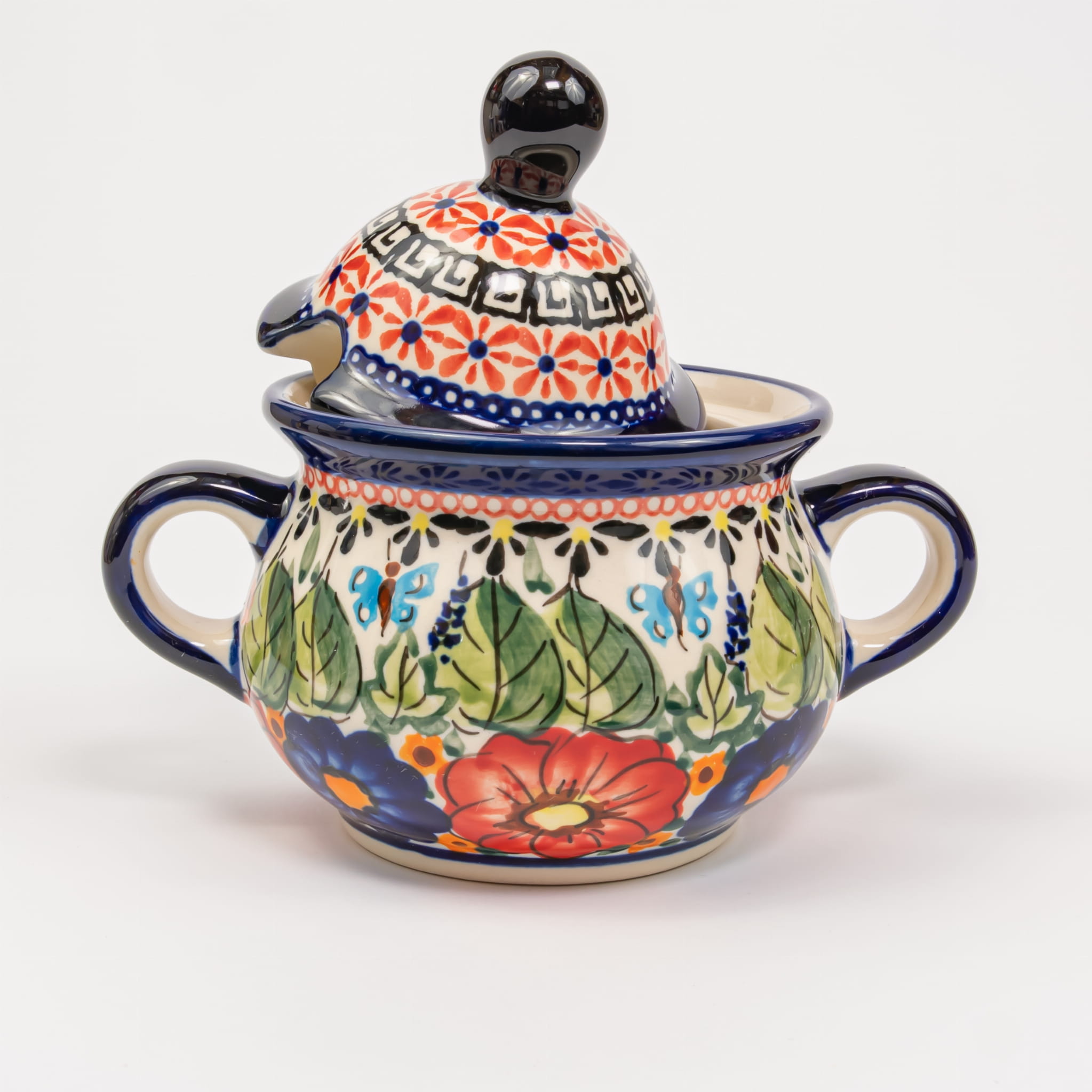 Cukiernica z dwoma uszkami, pojemność 0,35 L. Pokrywka cukiernicy posiada otwór na łyżkę oraz wygodny uchwyt. Produkt wykonany z glinki ceramicznej, ręcznie formowany i dekorowany w Zakładach Ceramicznych w Bolesławcu.