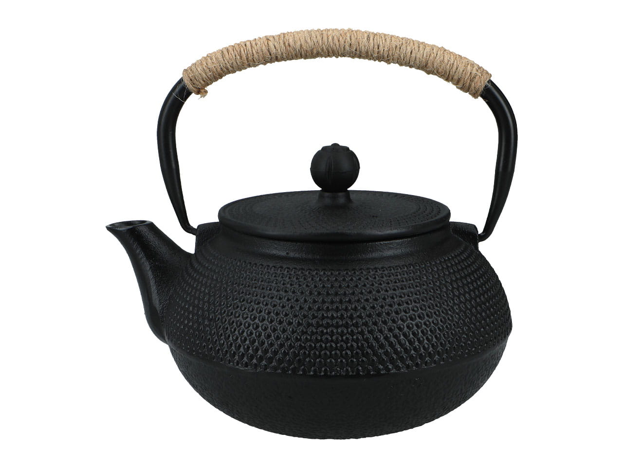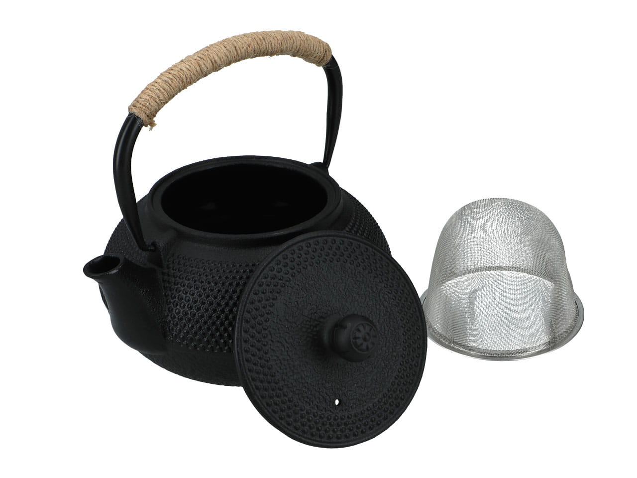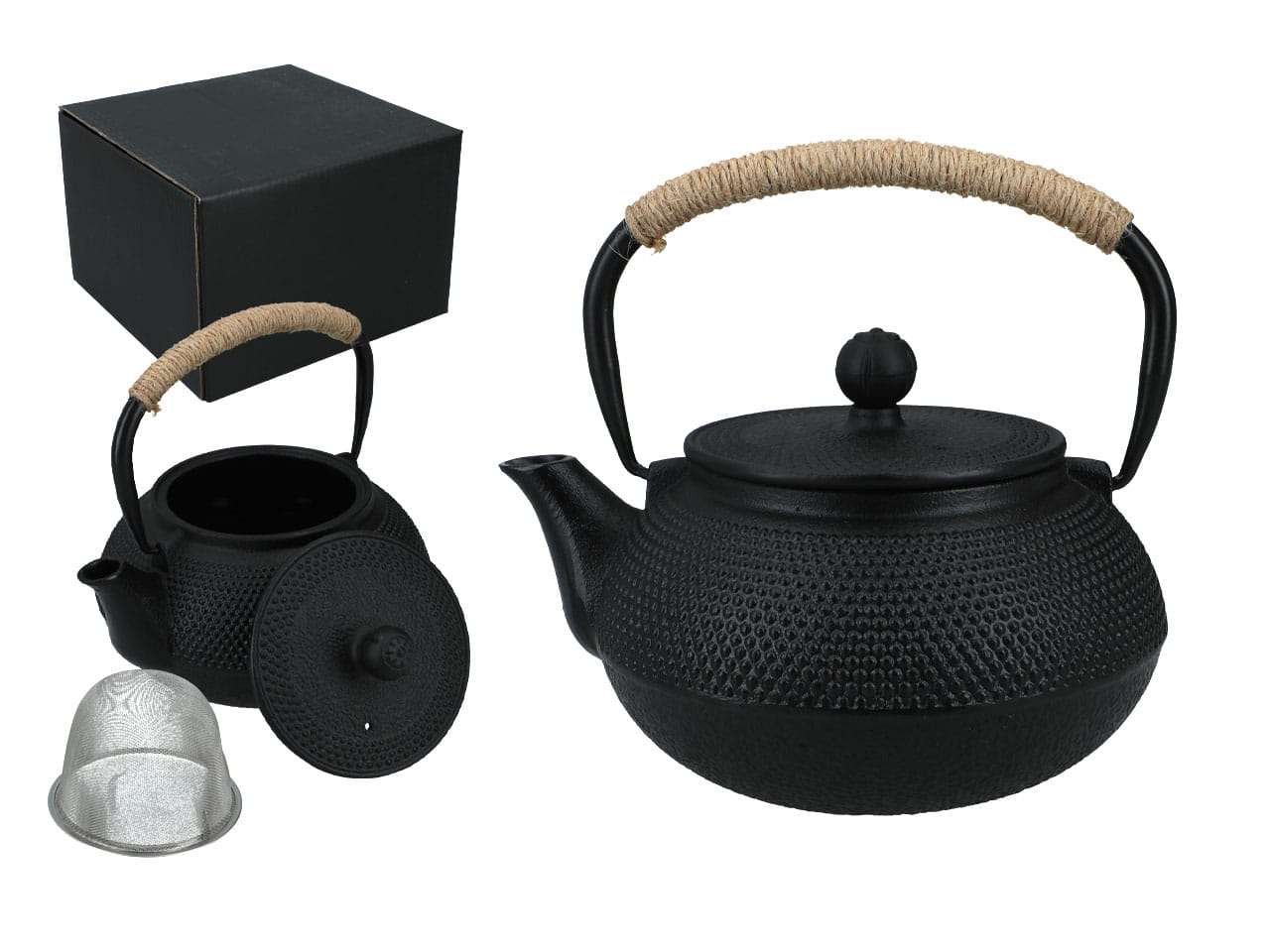 Żeliwny czajnik z emaliowanym wkładem. Dzbanek posiada metalowe sitko do zaparzania herbaty luz ziół.
