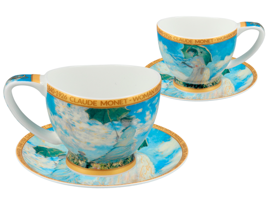 Filiżanka ze spodkiem z motywem malarstwa Claude Monet - Kobieta z parasolem. Kolekcja Carmani charakteryzuje się doskonałą jakością porcelany oraz pięknym zdobieniem.