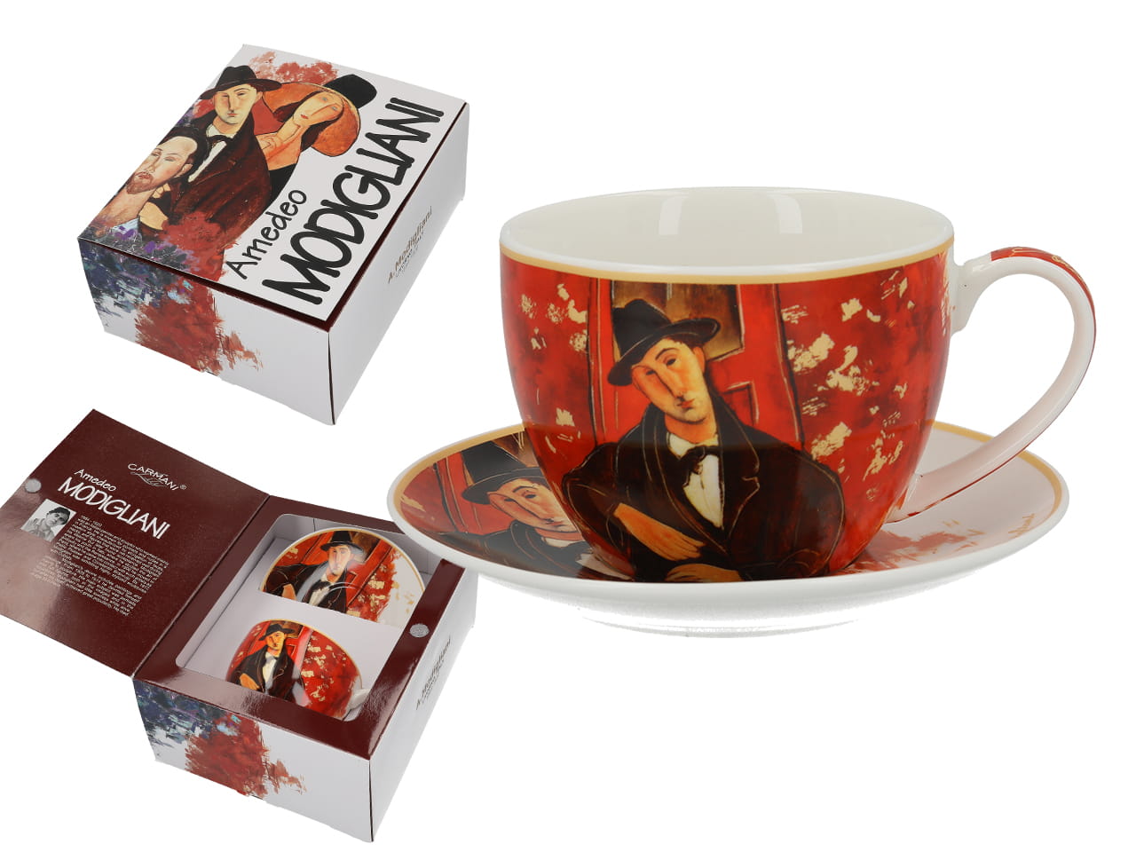 Uniwersalna, klasyczna filiżanka ze spodkiem, o wyraźnym kolorystycznie motywie inspirowanym obrazem tego włoskiego malarza, rzeźbiarza i rysownika - Amedeo Modigliani'ego