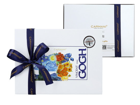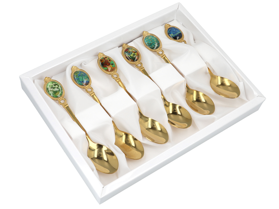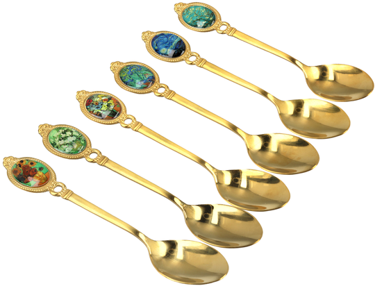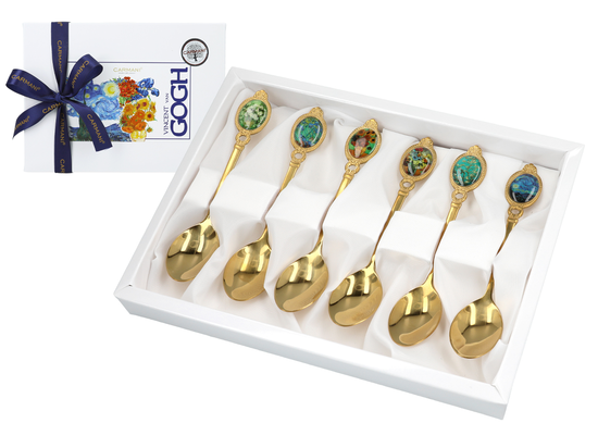 Komplet 6 łyżeczek pozłacanych marki Carmani z motywem malarstwa Vincenta Van Gogh - Mix. Zapakowane są w eleganckie opakowanie. Świetny pomysł na prezent. Nie nadają się do zmywarki.