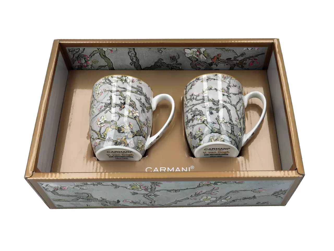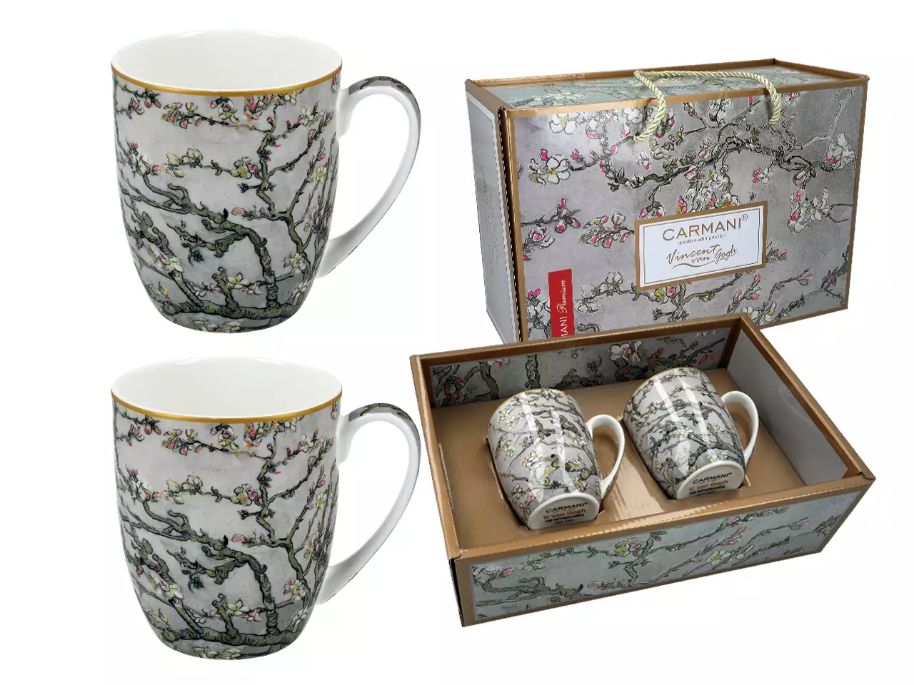 Zestaw 2 kubków z kolekcji Vincent van Gogh marki Carmani. Marka wyróżnia się na tle innych porcelaną bardzo wysokiej jakości oraz wyjątkową dbałością o szczegóły. Kubki ozdobione są motywem obrazu Van Gogha -Kwitnący migdałowiec. Komplet zapakowany jest w prezentowe pudełko z tym samym motywem .