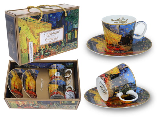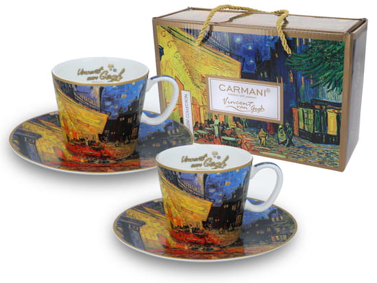 Zestaw eleganckiej porcelany do espresso. 2 Filiżanki z podstawkami z motywem obrazu Vincenta Van Gogha zapakowane w prezentowe pudełko.