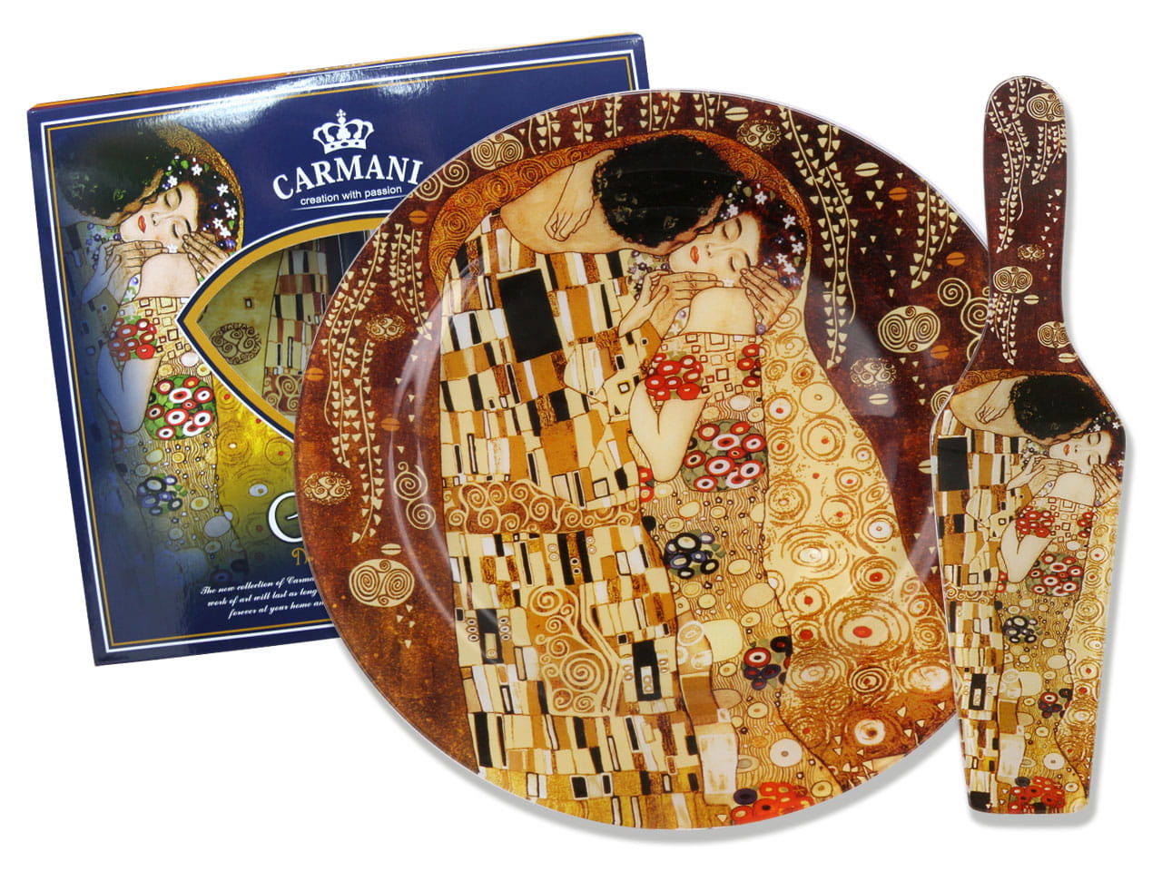 Szklany talerz z łopatką do ciasta. Zestaw z motywem obrazu Gustava Klimta - The Kiss Pocałunek został zapakowany w prezentowy, kolorowy kartonik.