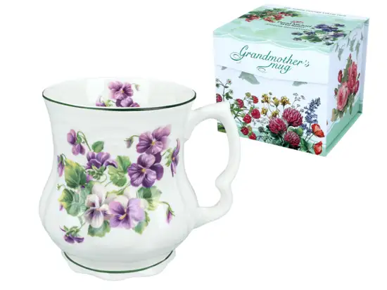 Jego unikalny, lekko pękaty kształt inspirowany stylem wiktoriańskim doskonale leży w dłoni i przywodzi na myśl tradycyjne kubki sprzed lat. Dekoracja w postaci fioletowych bratków nadaje mu ciepły, sentymentalny charakter, idealnie wpisujący się w estetykę vintage i klasyczną.