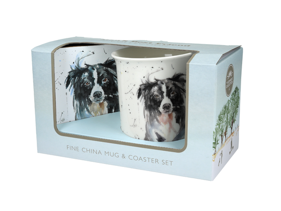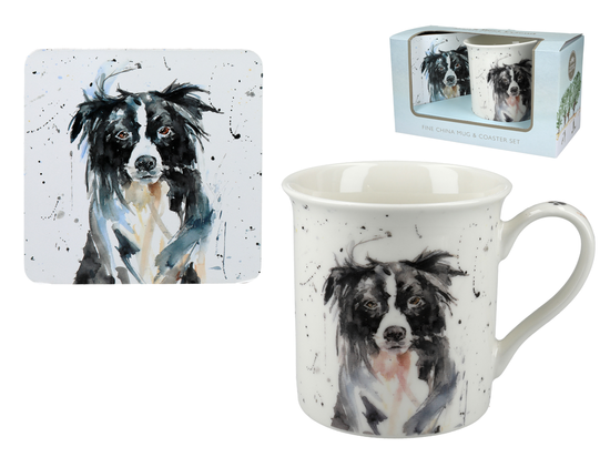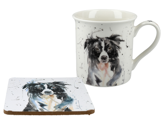 Kubek z podkładką z motywem psa Collie. Zapakowane jest w pudełeczko. Świetny pomysł na prezent dla fanatyków psów.