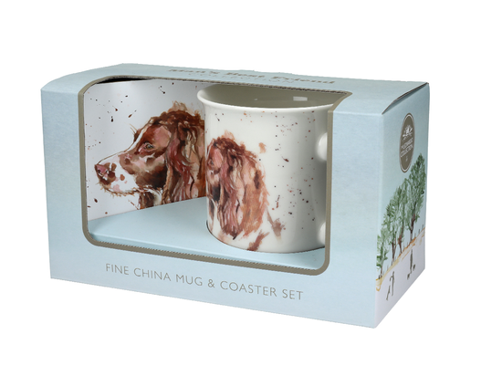 Kubek z podkładką z motywem psa Spaniel. Zapakowane jest w pudełeczko. Świetny pomysł na prezent dla fanatyków psów.