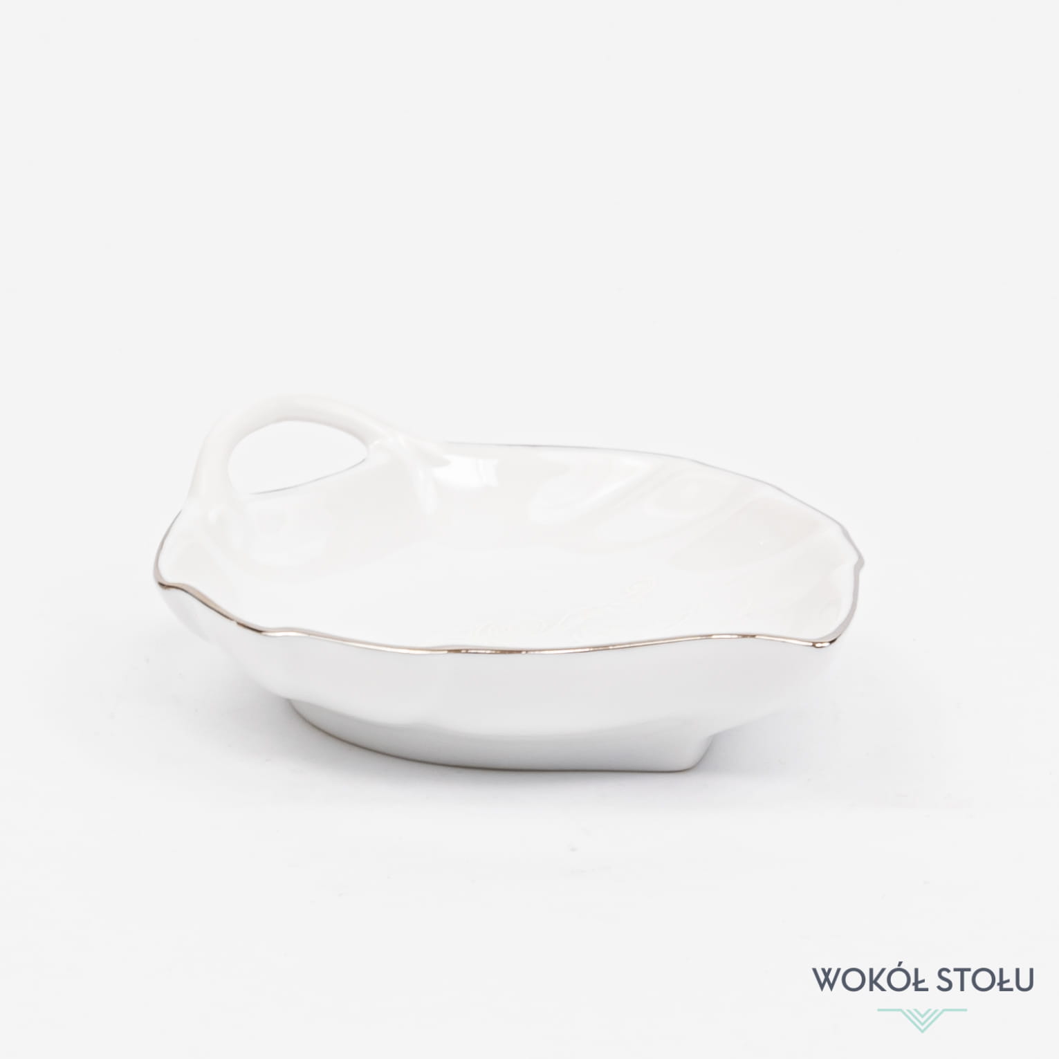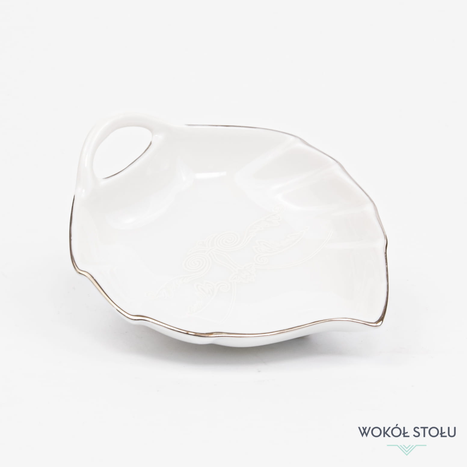 Salaterka - miseczka w kształcie liścia z kolekcji Antonio Platin - Porcelana Śląska Bogucice. Mały dodatek uzupełniający serwis może posłużyć jako miseczka - talerzyk na przystawki lub tea bag na herbatę ekspresową.