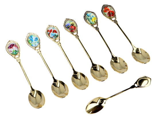 Łyżeczka pozłacana marki Carmani z motywem kwiatów. Świetny pomysł na prezent. Wzory nawiązujące do kolekcji porcelany Heritage - Maki, Bratki, Irysy, Dzwoneczki Bluebell, Fuksja,