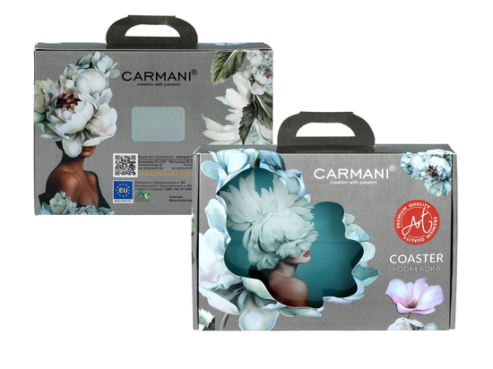 Podkładka szklana z motywem kwiatów na głowie w kolorze turkusu. Posiada sylikonowe nóżki. Zapakowana jest w pudełko z tym samym motywem. Świetny pomysł na prezent.