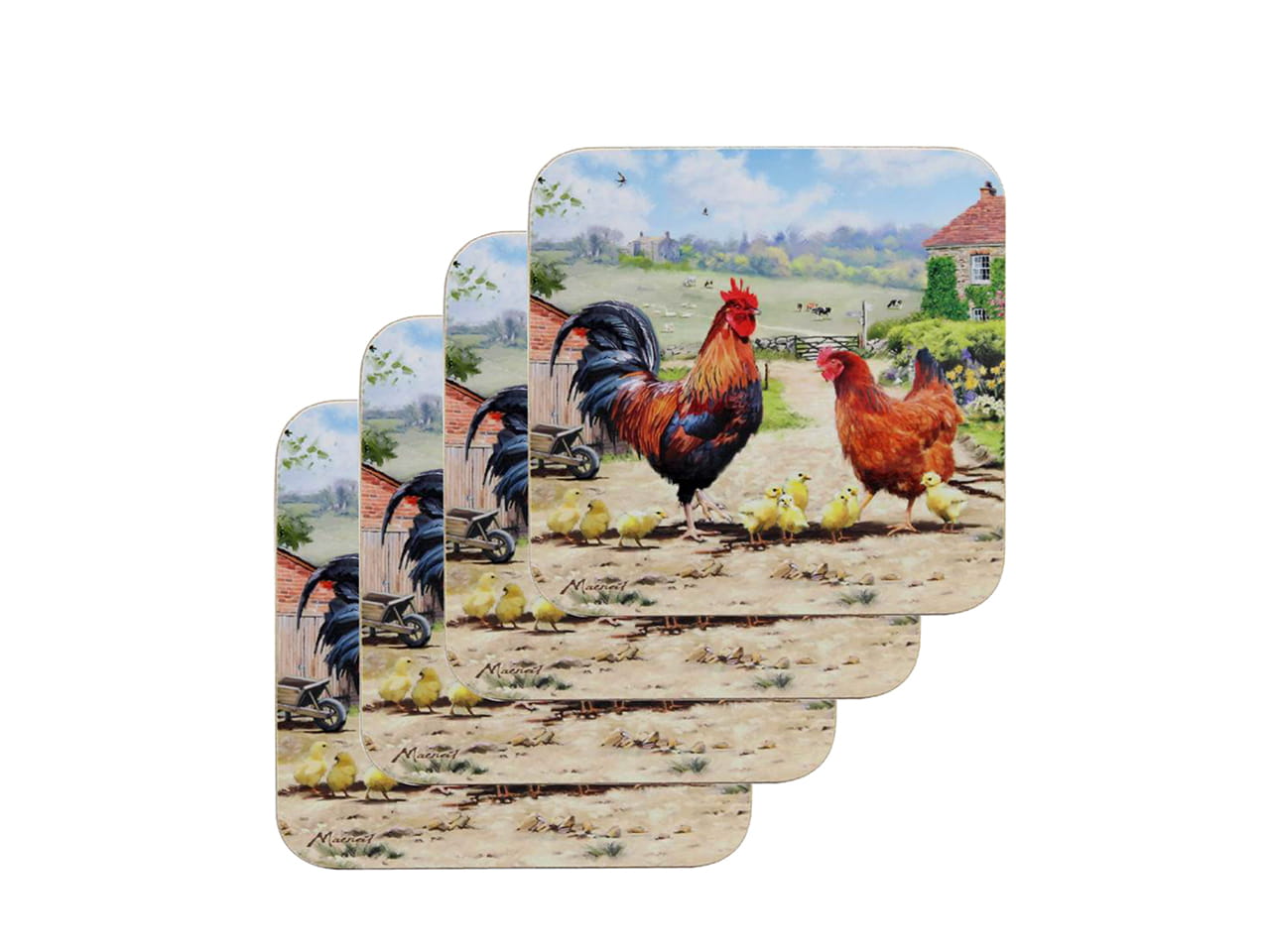 Zestaw 4 podkładek korkowych o wymiarach 11x11 cm, zapakowany w kolorowy kartonik.