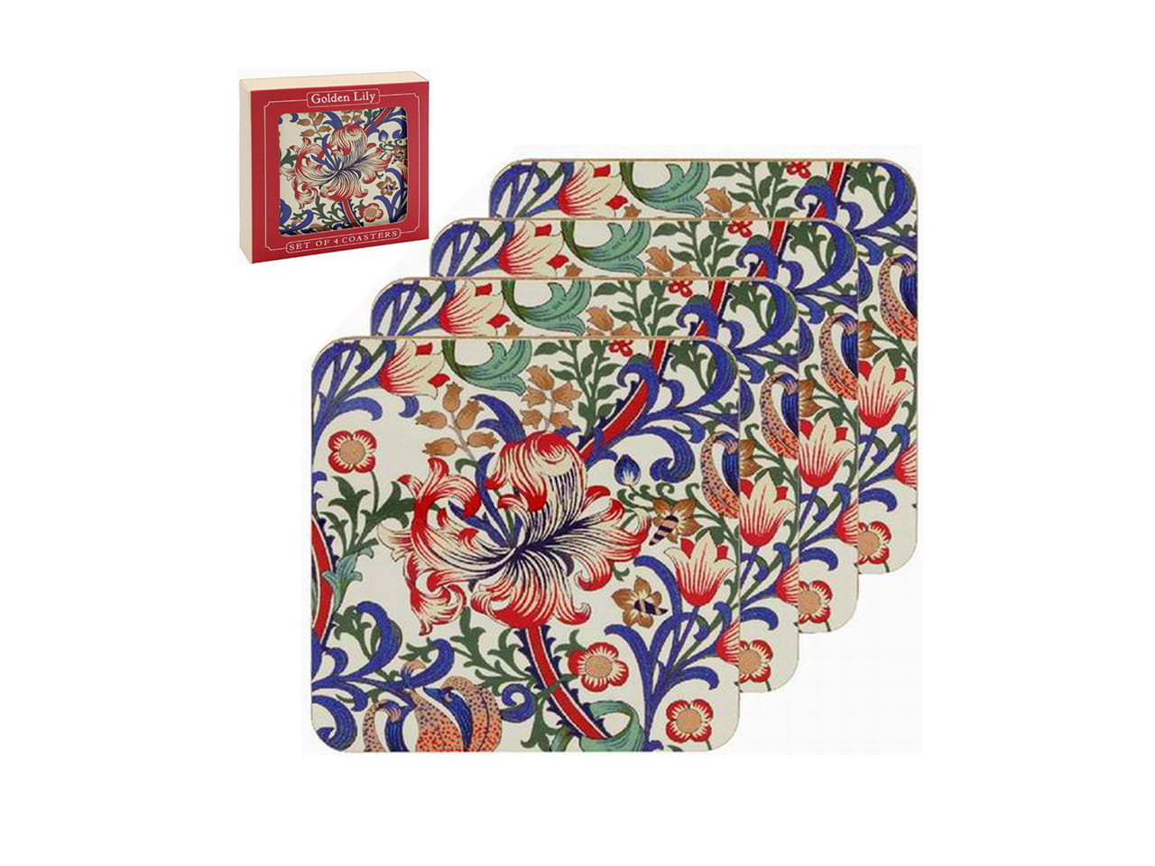 Zestaw 4 podkładek korkowych o wymiarach 11x11 cm, zapakowany w kolorowy kartonik.