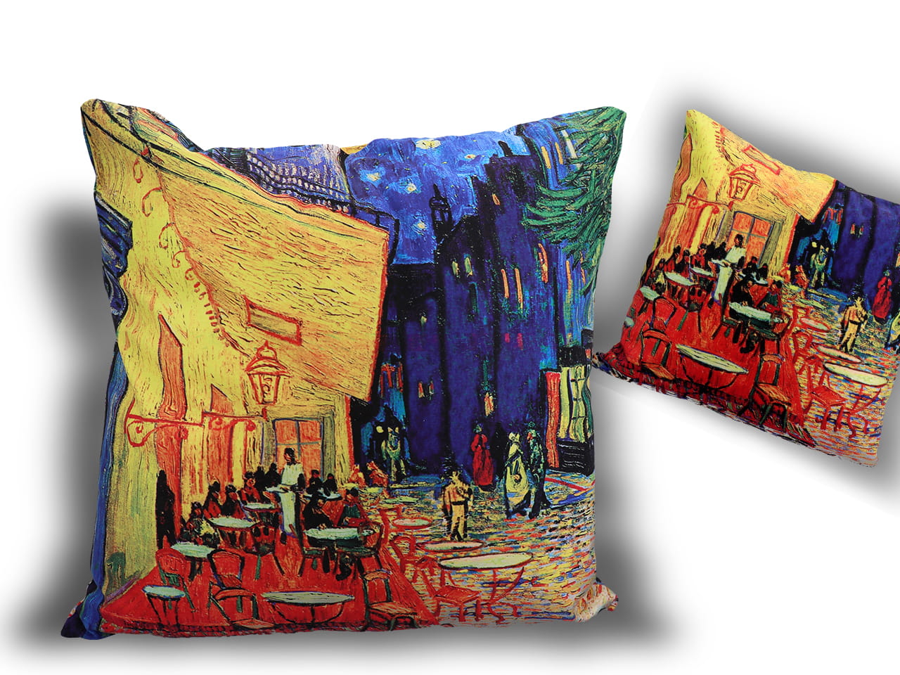 Na poszewce ukazano fragment obrazu Vincenta van Gogha - Taras kawiarni nocą .