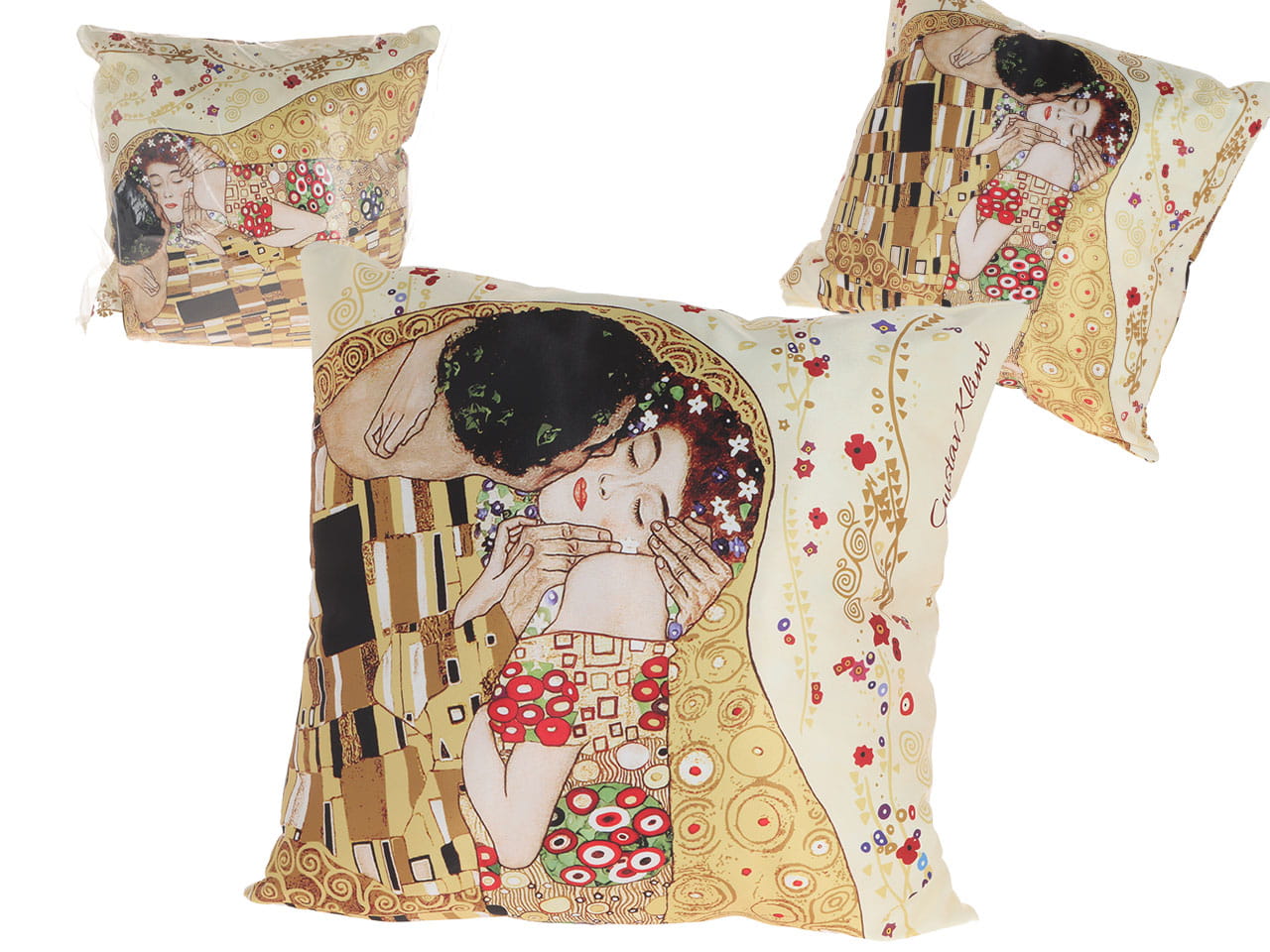 Poduszka z wypełnieniem/suwak - G. Klimt, Pocałunek (kremowe tło). Taki dodatek nada wnętrzu stylowy wygląd. Poszewka wykonana jest z wysokiej jakości materiału- weluru.
