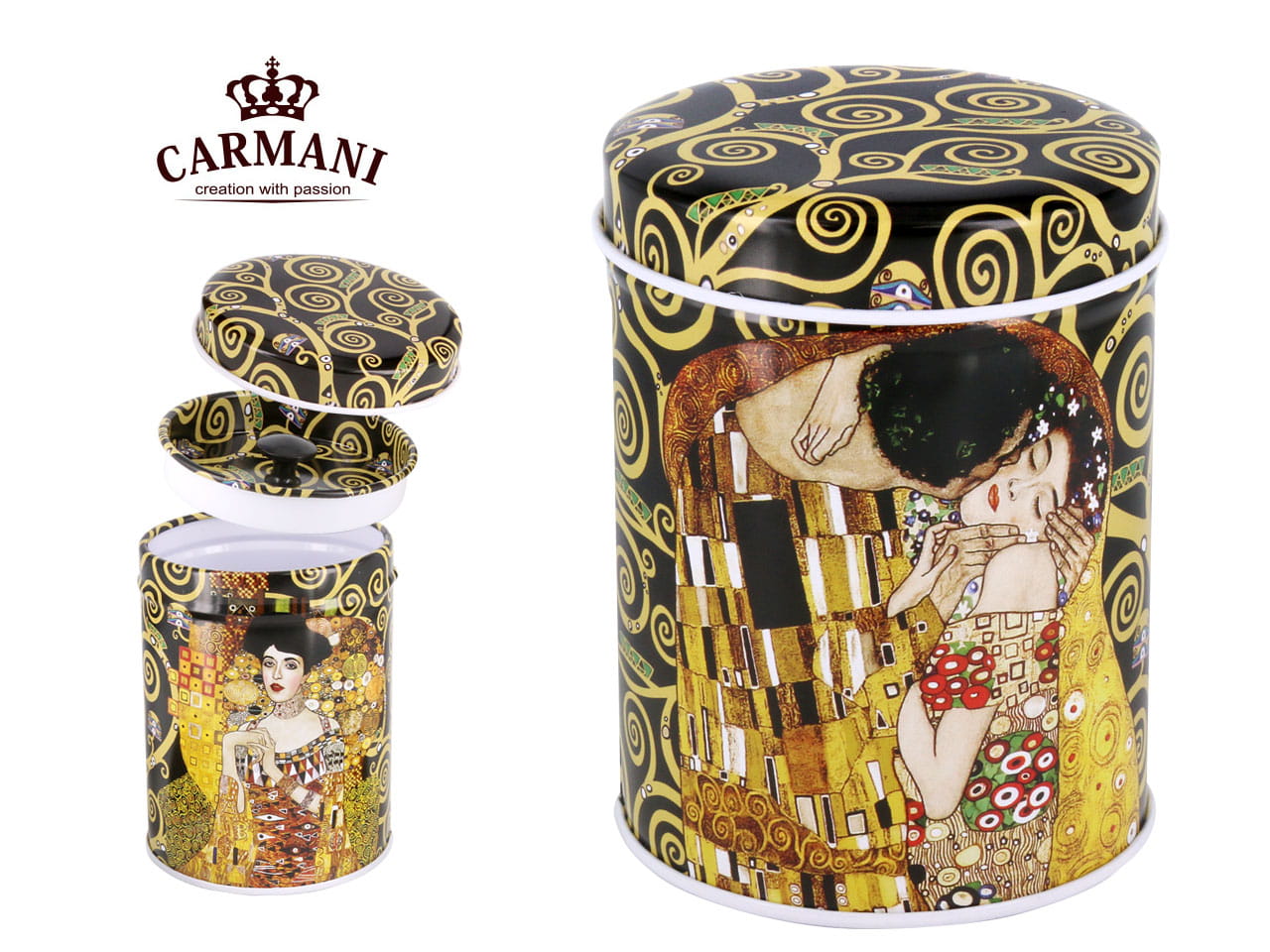 Metalowa puszka z motywem obrazu Adele i Pocałunek Gustava Klimta.