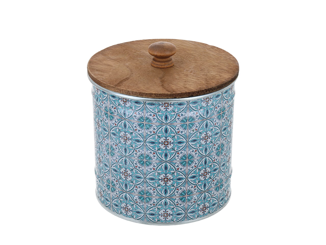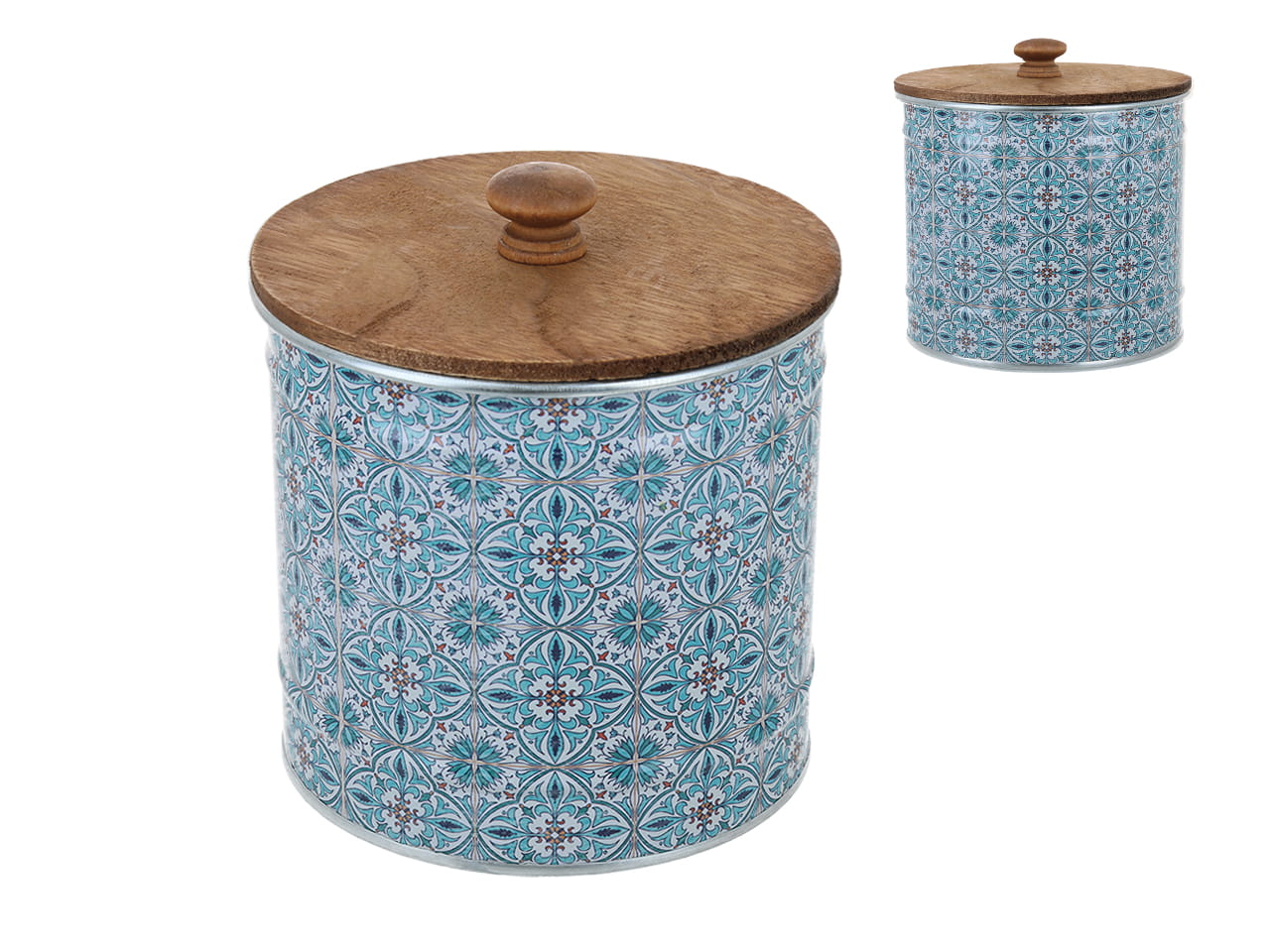 Niewielka Puszka metalowa z drewnianą pokrywką, w orientalny wzór o wymiarach 12,5 *12 cm i wadze netto 0,08 kg.