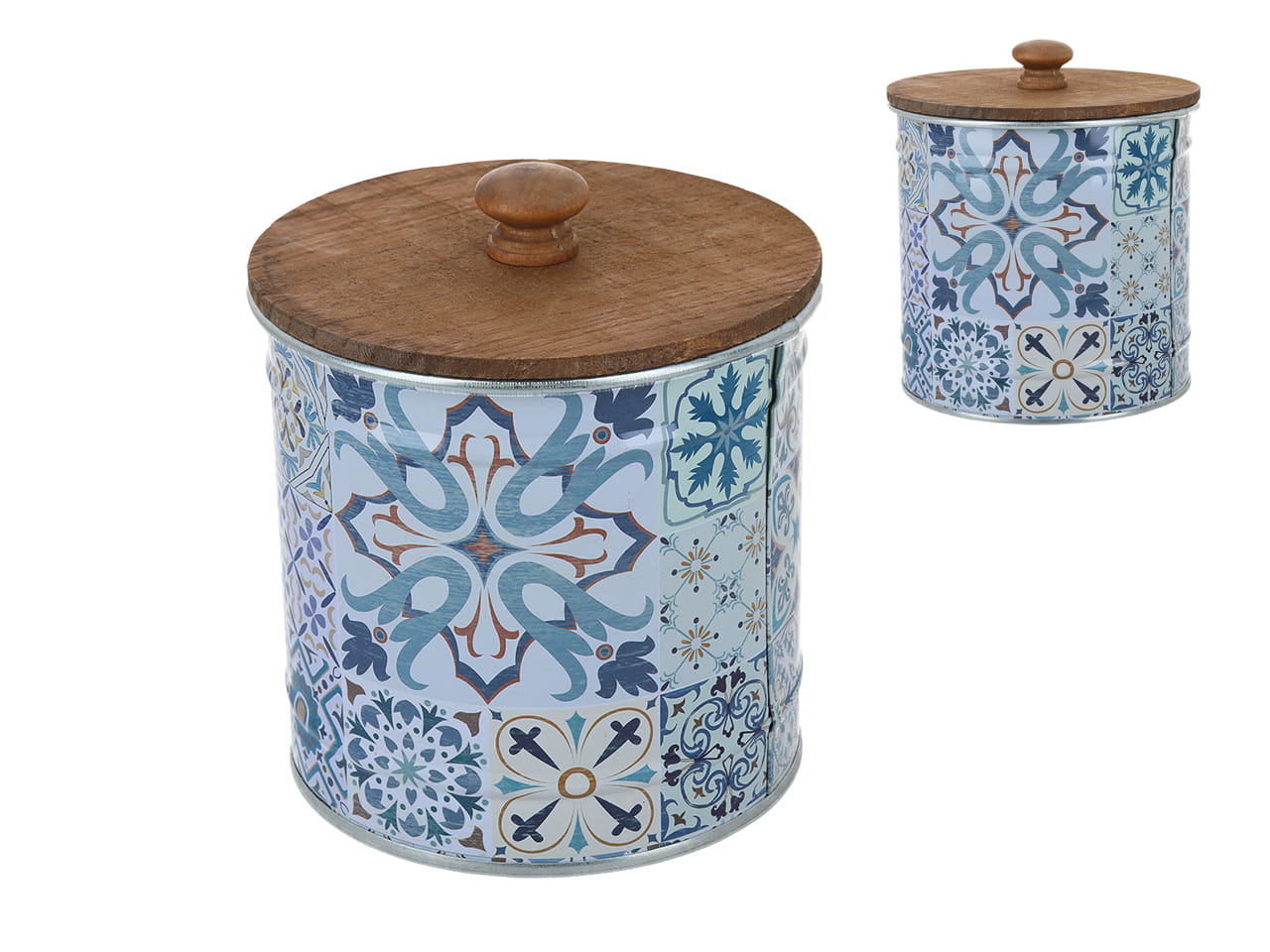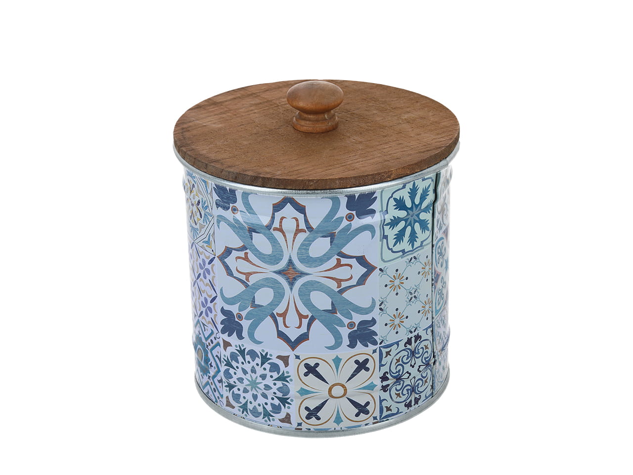Niewielka Puszka metalowa z drewnianą pokrywką, w orientalny wzór o wymiarach 12,5 x 12 cm.
