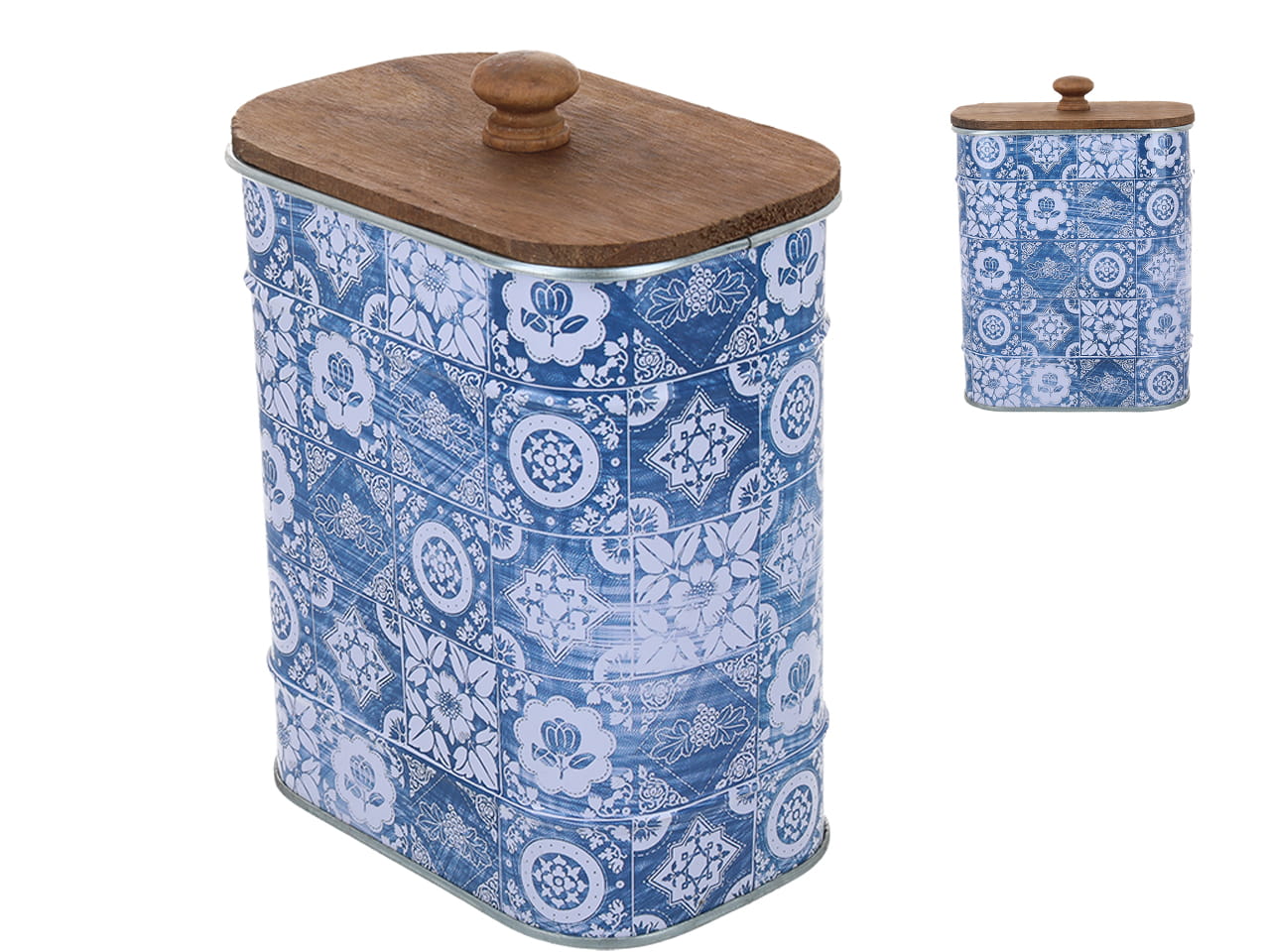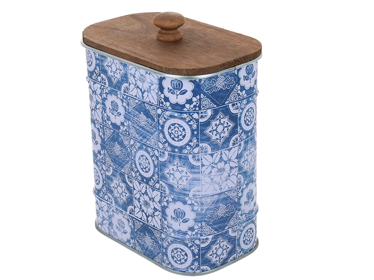 Puszka metalowa z drewnianą pokrywką, w orientalny wzór o wymiarach 13 x 8.5 x 16.3 cm.
