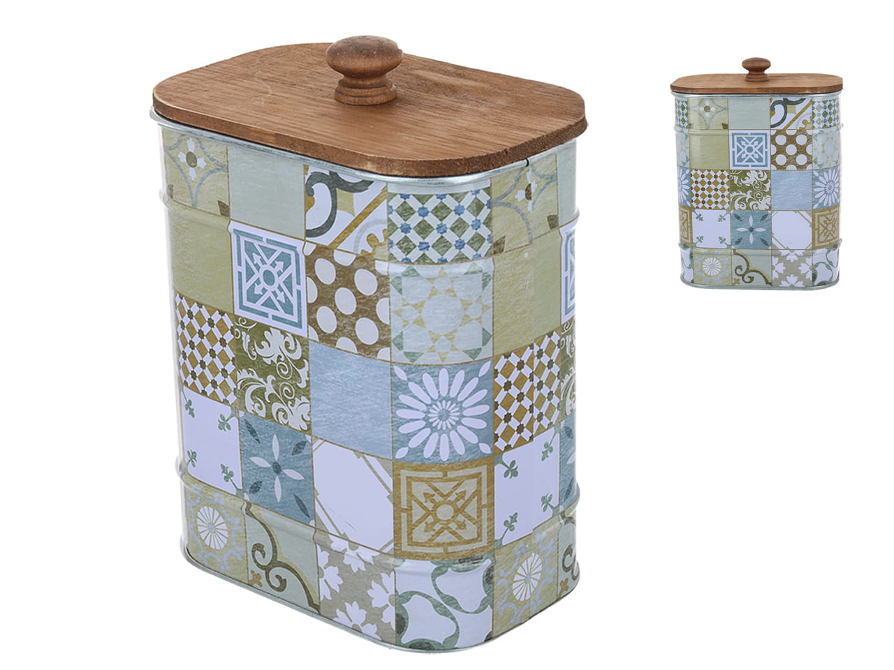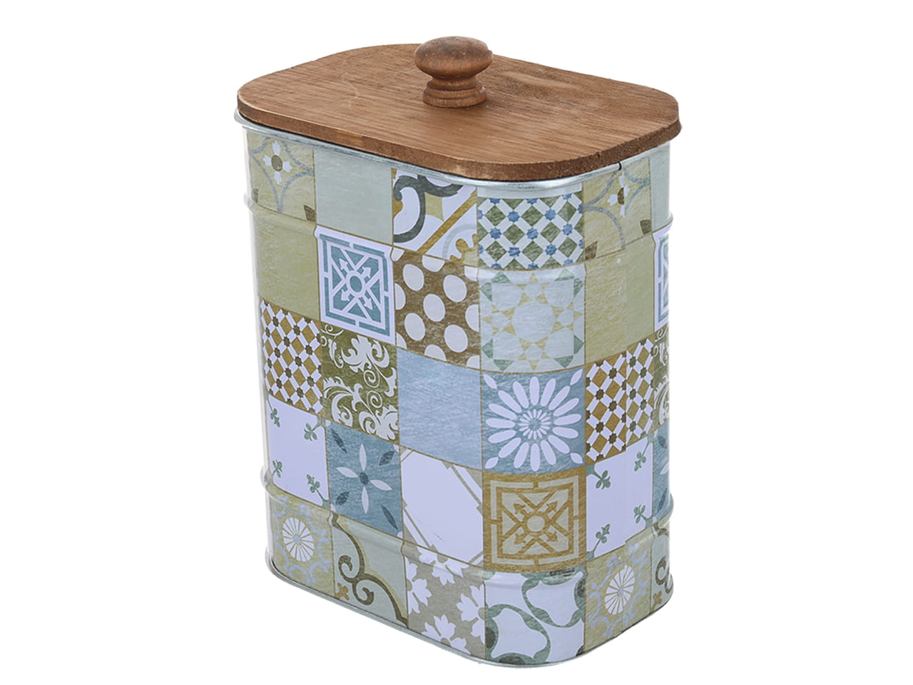 Puszka metalowa z drewnianą pokrywką, w orientalny wzór o wymiarach 13 x 8.5 x 16.3 cm.
