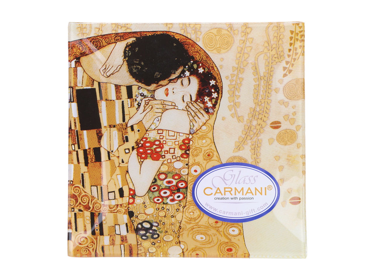 Szklany talerz dekoracyjny z motywem obrazu Pocałunek Gustava Klimta.
