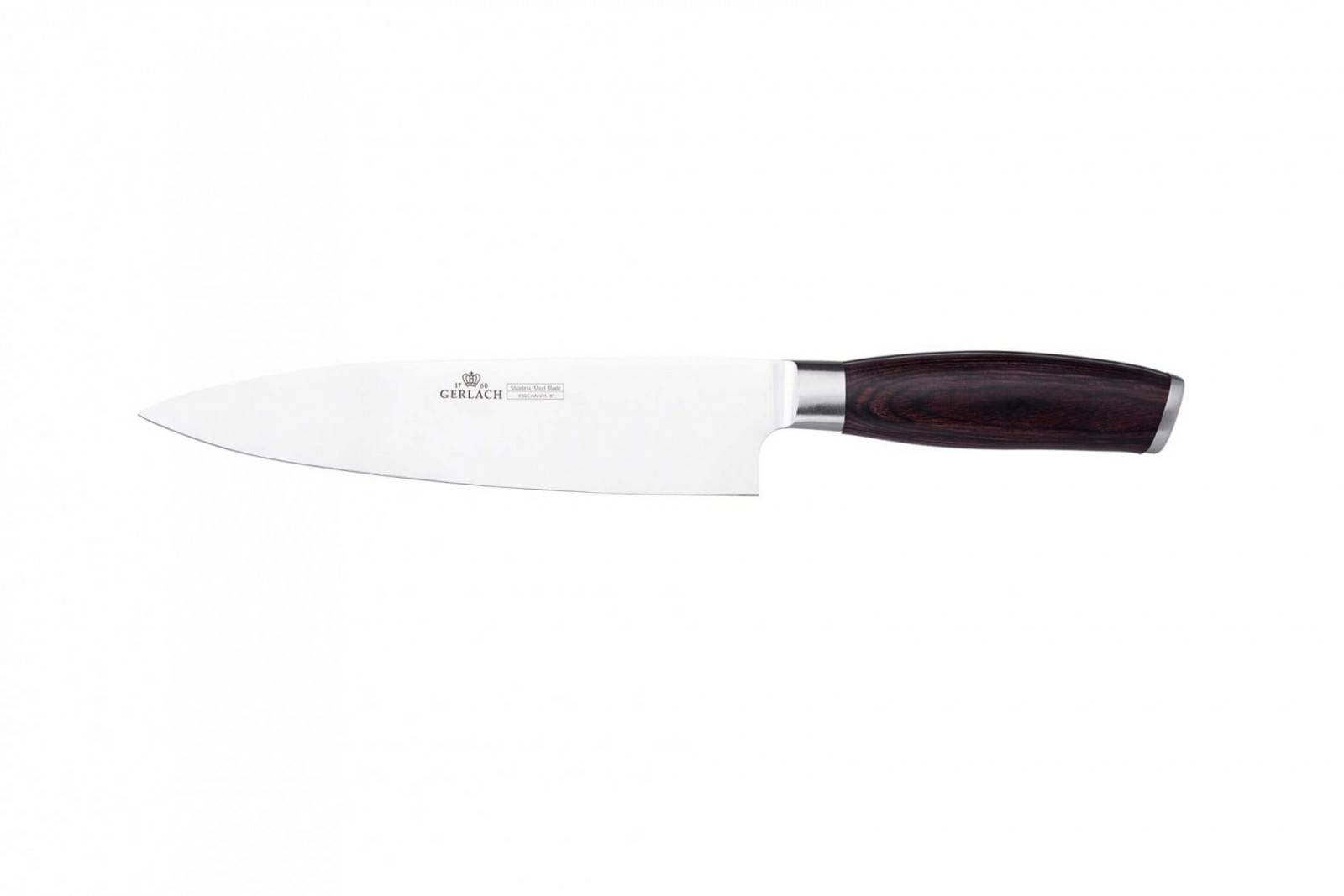 Noże kuchenne 991 są połączeniem funkcjonalności z najwyższą jakością materiałów. Idealnie wyważone, precyzyjne ostrza ze stali nierdzewnej X50CrMoV15 z dodatkiem chromu, molibdenu i wanadu, pozwolą na długie i wygodne krojenie. Twardość ostrza noża Deco Wood na skali Rockwella wynosi 53-55 HRC. Skala Rockwella wskazuje na umiejętność zachowania ostrości przez dany okres czasu oraz bada odporność na uszkodzenia mechaniczne i przeciążenia ostrza. Twarde noże długo zachowują ostrość, jednocześnie są trudniejsze w ostrzeniu, mniej giętkie i bardziej podatne na pęknięcia oraz wykruszenia. Każdy nóż powinien być sztywny, aby precyzyjnie kroić różne składniki, z drugiej zaś strony musi być na tyle elastyczny, by podczas zmiany kąta krojenia lub dużego nacisku, nie pękał. W większości przypadków, twardość dla noży kuchennych podaje się od 52 stopni HRC, natomiast 57-58 HRC oznacza już twardą stal. Twardość ostrzy noży kuchennych Gerlach została tak dostosowana, aby zapewnić niezwykle precyzyjne i ostre cięcie, a jednocześnie zminimalizować prawdopodobieństwo złamania się ostrza podczas intensywnego użytkowania. Ergonomiczne rękojeści noży Deco Wood wyprodukowane zostały z drewna pakka, które powstaje z kawałków drzew egzotycznych. Proces wytwarzania polega na klejeniu i prasowaniu drewna pod dużym ciśnieniem. Powstaje wtedy idealny materiał do produkcji rękojeści noży, ponieważ nie absorbuje on wody oraz wyróżnia się twardością i odpornością na odkształcenia lub wykrzywienia. Jak wiele noży firmy Gerlach, również produkty w zestawie Deco Wood oznaczone zostały pomocniczymi symbole na rękojeści, które szybko pomogą w wyborze odpowiedniego noża do krojenia. Komplet noży dostępny jest z blokiem z lakierowanego drewna bukowego. Aby noże kuchenne Gerlach jak najdłużej cieszyły nas swoją niezawodnością i pięknym wyglądem, zalecamy myć je ręcznie. W linii dostępnych jest pięć noży o różnych funkcjach w zależności od wykończenia i wielkości. Sprawdzą się one wyśmienicie podczas krojenia pomidorów, szatkowania sałaty, czy rozcinania mięsa.