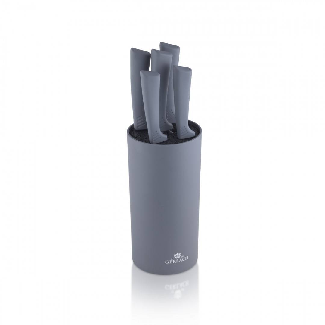 Smart to gwarancja jakości ostrzy noży Gerlach. Doskonała ostrość i twardość to główne cechy tej linii. Twardość ostrza noży Smart Grey na skali Rockwella wynosi 54-56 HRC. Skala Rockwella wskazuje na umiejętność zachowania ostrości przez dany okres czasu oraz bada odporność na uszkodzenia mechaniczne i przeciążenia ostrza. Twarde noże długo zachowują ostrość, jednocześnie są trudniejsze w ostrzeniu, mniej giętkie i bardziej podatne na pęknięcia oraz wykruszenia. Każdy nóż powinien być sztywny, aby precyzyjnie kroić różne składniki, z drugiej zaś strony musi być na tyle elastyczny, by podczas zmiany kąta krojenia lub dużego nacisku, nie pękał. W większości przypadków, twardość dla noży kuchennych podaje się od 52 stopni HRC, natomiast 57-58 HRC oznacza już twardą stal. Twardość ostrzy noży kuchennych Gerlach została tak dostosowana, aby zapewnić niezwykle precyzyjne i ostre cięcie, a jednocześnie zminimalizować prawdopodobieństwo złamania się ostrza podczas intensywnego użytkowania. Noże wykonane zostały ze stali nierdzewnej X30Cr13 z dodatkiem chromu, który zwiększa odporność na korozję. Ergonomiczna, antypoślizgowa rękojeść została tak zaprojektowana, by gwarantować jak największy komfort podczas użytkowania. Materiał typu Soft Touch gwarantuje pewny chwyt, nawet w mokrych dłoniach. Komplet dostępny jest w nowoczesnym, matowym bloku z tworzywa. Aby noże kuchenne Gerlach jak najdłużej cieszyły nas swoją niezawodnością i pięknym wyglądem, zalecamy myć je ręcznie. Zestaw noży Smart zawiera różne rodzaje i wielkości noży, które usprawnią pracę w kuchni i pozwolą na proste i przyjemne przygotowywanie posiłków.
